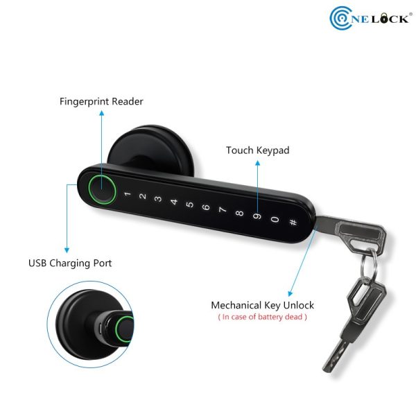Khóa vân tay OneLock BR006 với thiết kế nhỏ gọn dùng để lắp đặt cho phòng ngủ, cửa thông phòng với 4 chức năng mở khóa: SmartPhone, vân tay, mật khẩu, chìa khóa cơ.